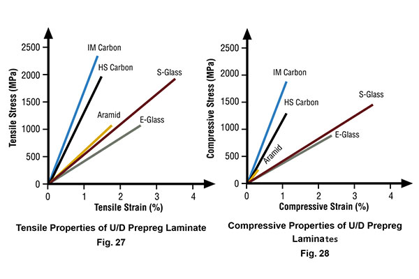 看上圖關于不同復合材料層壓板在失效時的強度和最大應變,梯度越陡則性能越好,對比的有碳纖維、芳綸、玻璃纖維增強材料層壓板的拉伸性能以及壓縮性能,芳綸纖維在拉伸和壓縮性能表現上面有很大的不同,這在實際應用中,就可以在拉伸性能需求的產品上應用,但是在壓縮性能就表現平平,進而要選擇玻璃纖維或者碳纖維增強的材料,整個的高性能還是碳纖維更優,這也是為什么碳纖維被稱為“黑色黃金”的一個關鍵原因。